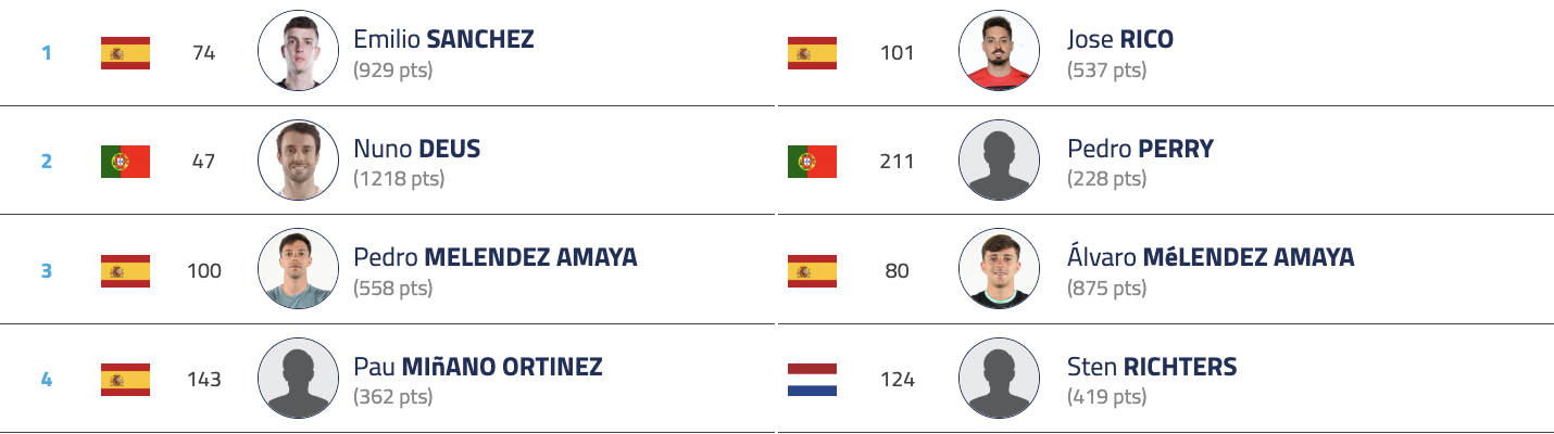 Som ventet er Spania tungt representert i toppen av trekningen. Spillere som Emilio Sanchez, Jose Rico, Pedro Melendez Amaya og Álvaro Meléndez Amaya kommer alle med solid erfaring og gode internasjonale rankingplasseringer!