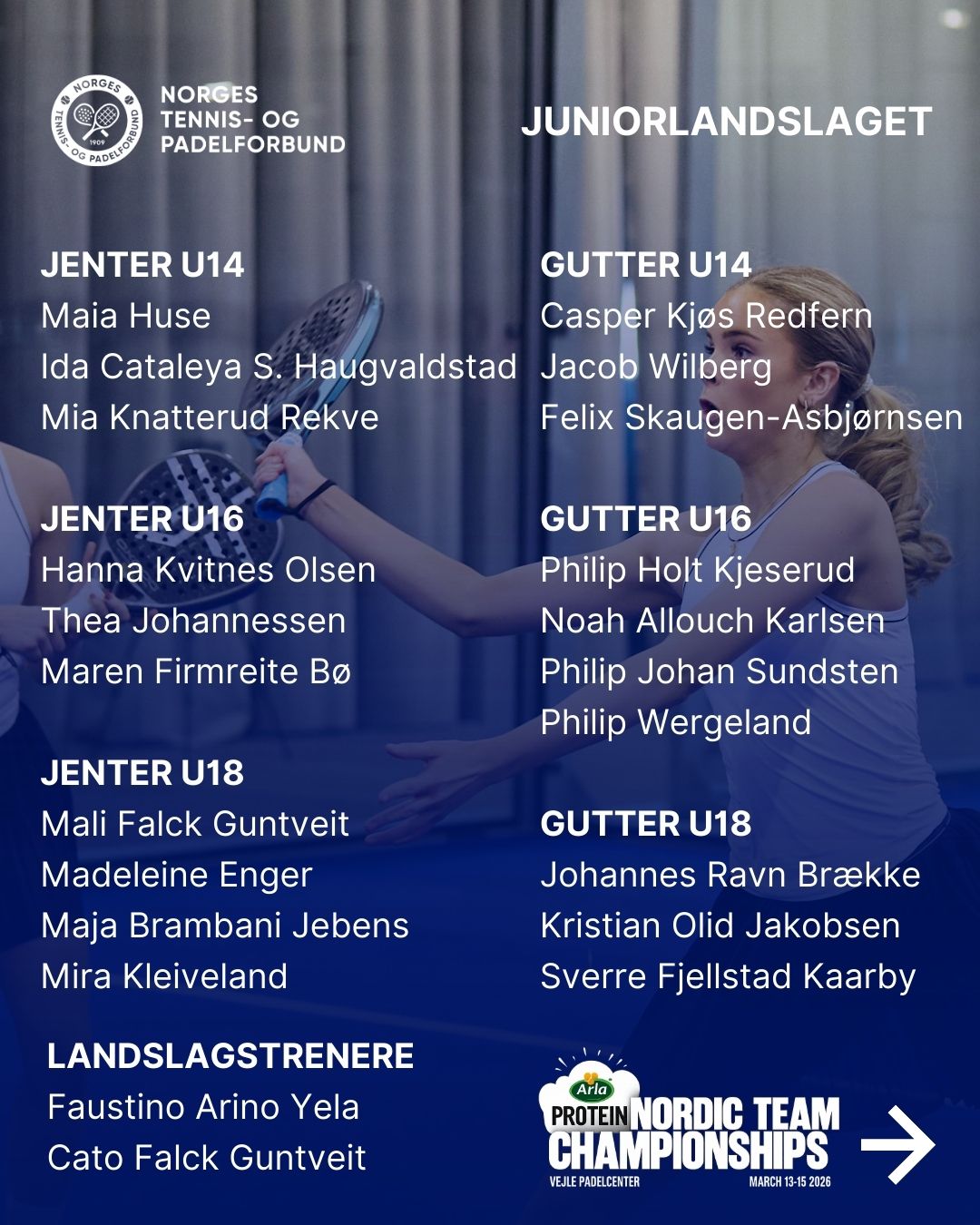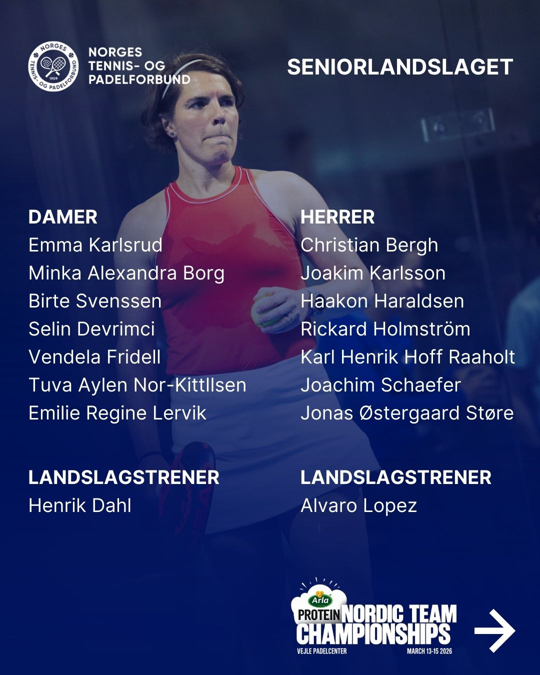 13.–15. mars samles Nordens beste padelspillere i Vejle, Danmark, når årets Nordiske Mesterskap arrangeres i moderne omgivelser ved Vejle Padelsenter. Norge stiller med en stor tropp, og de norske landslagstrenerne har nå tatt ut spillerne som skal representere landet.